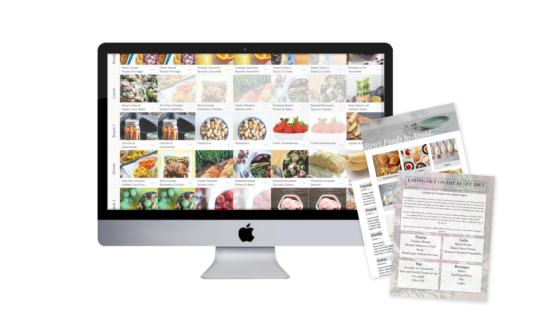 Reset Meal Plan, Grocery List, Reset Manual, Recipe Alternative Booklet, and the Daily Reset Checklist